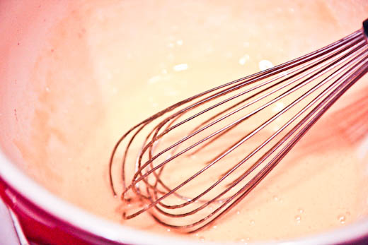 - Meanwhile, in a medium mixing bowl, whisk together the egg, egg yolks, sugar, and salt until slightly thickened and pale yellow in color.